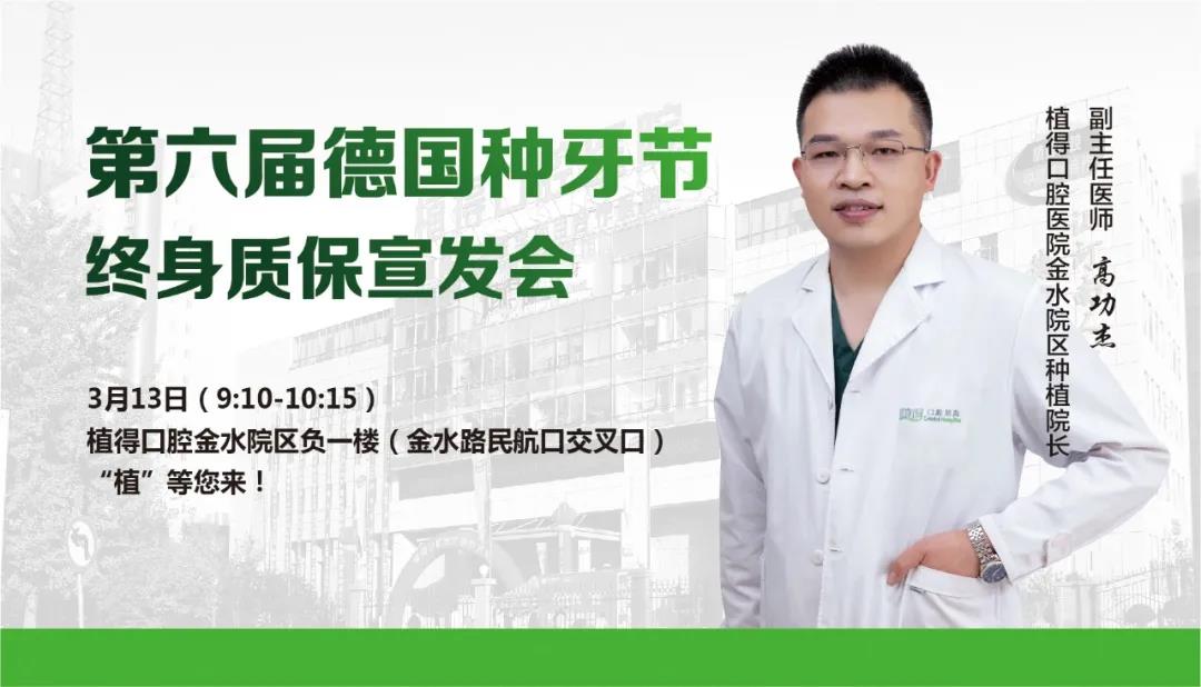 另外,3月13日,植得口腔金水院区负一楼将召开“第六届德国种牙节终身质保宣发会”,植得口腔医院金水院区种植院长、副主任医师高功杰医生将现场做“数字化种植时代的安全与品质”演讲。凡报名并到场参加“第六届德国种牙节终身质保宣发会”的顾客,均可获得植得种植牙终身质保卡一张。敬请期待!